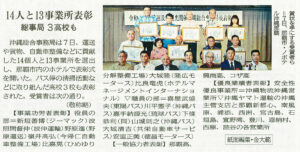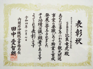 沖縄での長年にわたる、観光振興活動及びリザンシーパークホテル谷茶ベイの経営努力を認められ、この度「事業功労者」として内閣府・沖縄総合事務局から表彰されました。