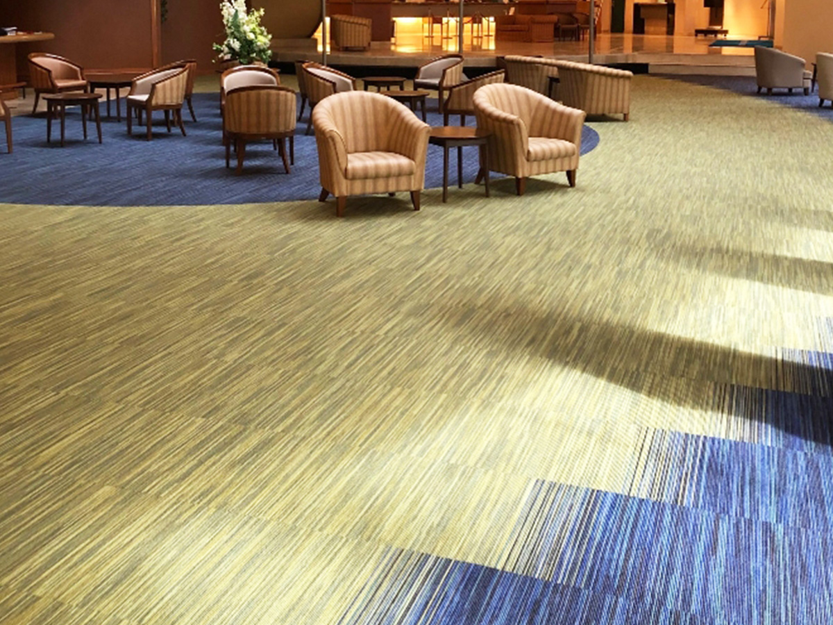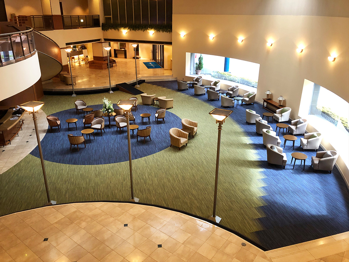 中央のレストランを移動し、吹き抜けのエリアを開放感のある憩いのスペースに床は“水”をイメージし、グラデーションを活かしたモダンなものに